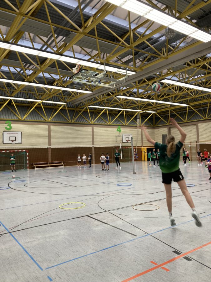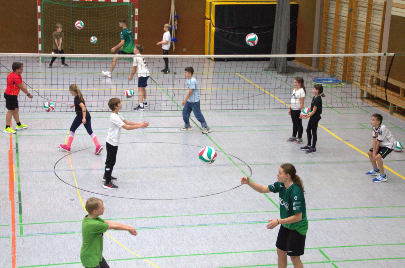 Der größte AOK Schulaktionstag vom Volleyball-Landesverband Württemberg (VLW) fand am 13.10.2025 am Hohenlohe-Gymnasium in Öhringen statt. Von der 1. bis zur 6. Schulstunde durchliefen alle Klassen der Stufe 5 und 6 in einer Doppelstunde mehrere Stationen in der Hohenlohehalle, um die Grundtechniken des Volleyballspiels zu erlernen. Dabei wurde beispielsweise Übungen zum Baggern, Pritschen und Aufschlag angeboten, welche durch erfahrene Trainer*innen und Spieler*innen der Volleyballspielgemeinschaft (VSG) Öhringen/Untersteinbach angeleitet wurden. Ergänzt wurde das Trainerteam von zwei Spielerinnen des Bundesstützpunktes aus Stuttgart, welche auf dem Weg zur Profikarriere den Schülerinnen und Schülern wertvolle Tipps aus der Praxis mitgeben konnten. In einer weiteren Station durften die Kinder ihr Können an der Reaktionswand und bei unterschiedlichen Koordinationsübungen unter Beweis stellen.