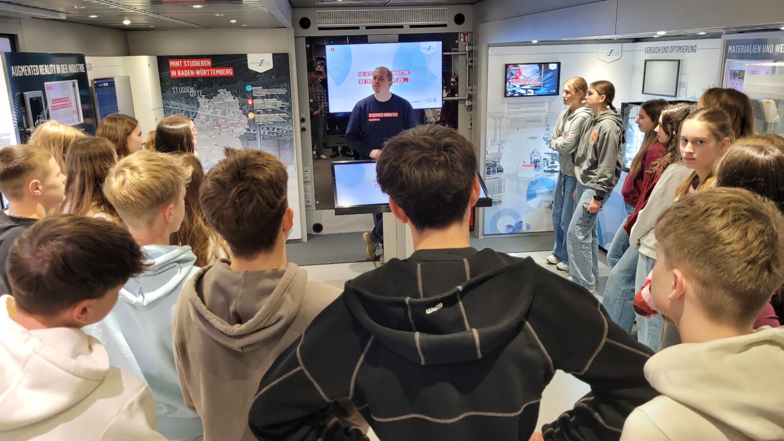 Im Inneren des Trucks lernen die Schülerinnen und Schüler ab der 9. Jahrgangsstufe gemeinsam mit den Coaches Marco Umstätter und Marcel Michel, wie in der modernen Industrie gearbeitet wird. Zugleich erfahren sie, wie sie später mit einer technischen Ausbildung oder einem Ingenieurberuf an wichtigen Themen wie erneuerbaren Energien, moderner Medizin oder der Mobilität von morgen mitarbeiten können.
