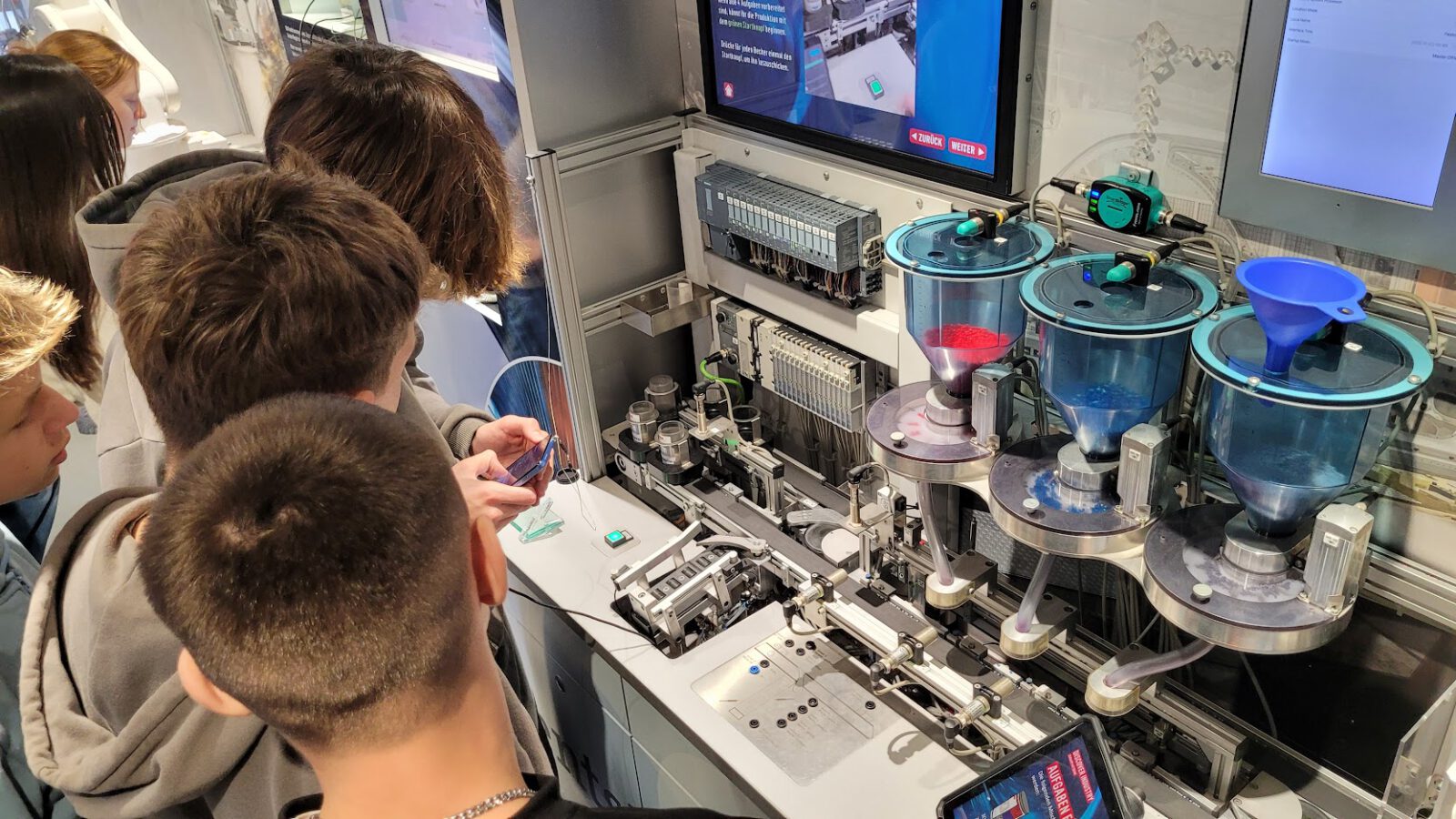 Dazu schlüpfen die Jugendlichen bei ihrem Rundgang durch den Truck in die Rolle von Gründerinnen und Gründern, die ein selbst erdachtes Produkt auf den Markt bringen wollen. Welche Schritte dazu nötig sind, erfahren sie an fünf Arbeitsstationen. Als erstes erstellen sie mithilfe eines 3D-Scanners einen digitalen Prototyp, indem sie Objekteeinscannen und so CAD-Daten erhalten, die am Computer weiterbearbeitet werden können. Danach werfen sie mit einem Digitalmikroskop einen genauen Blick auf Werkstücke und Materialien oder drucken mit dem 3D-Drucker Testobjekte aus. Wer das geschafft hat, kann ausprobieren, wie man einen Industrieroboter durch ein Koordinatensystem lotst, bevor eine smarte Abfüllanlage zeigt, wie Maschine und Produkt über RFID-Chips miteinander „sprechen“. Zum Schluss geht es um die Intralogistik, wenn in einem virtuellen Lager ein Motorblock auf die letzten Teile wartet. Mithilfe einer VR-Brille machen sich die Schülerinnen und Schüler in Leinzell auf die Suche und bauen diese ein.