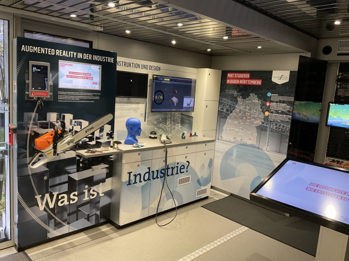 Bei der anschließenden freien Erkundungstour durch die Ausstellung im Truck können sie weitere Hightech-Anwendungen selbst ausprobieren und dabei etwa mit Augmented Reality (AR) eine Motorsäge warten oder mithilfe einer KI-gestützen Datenbrille einen PC zusammenbauen.