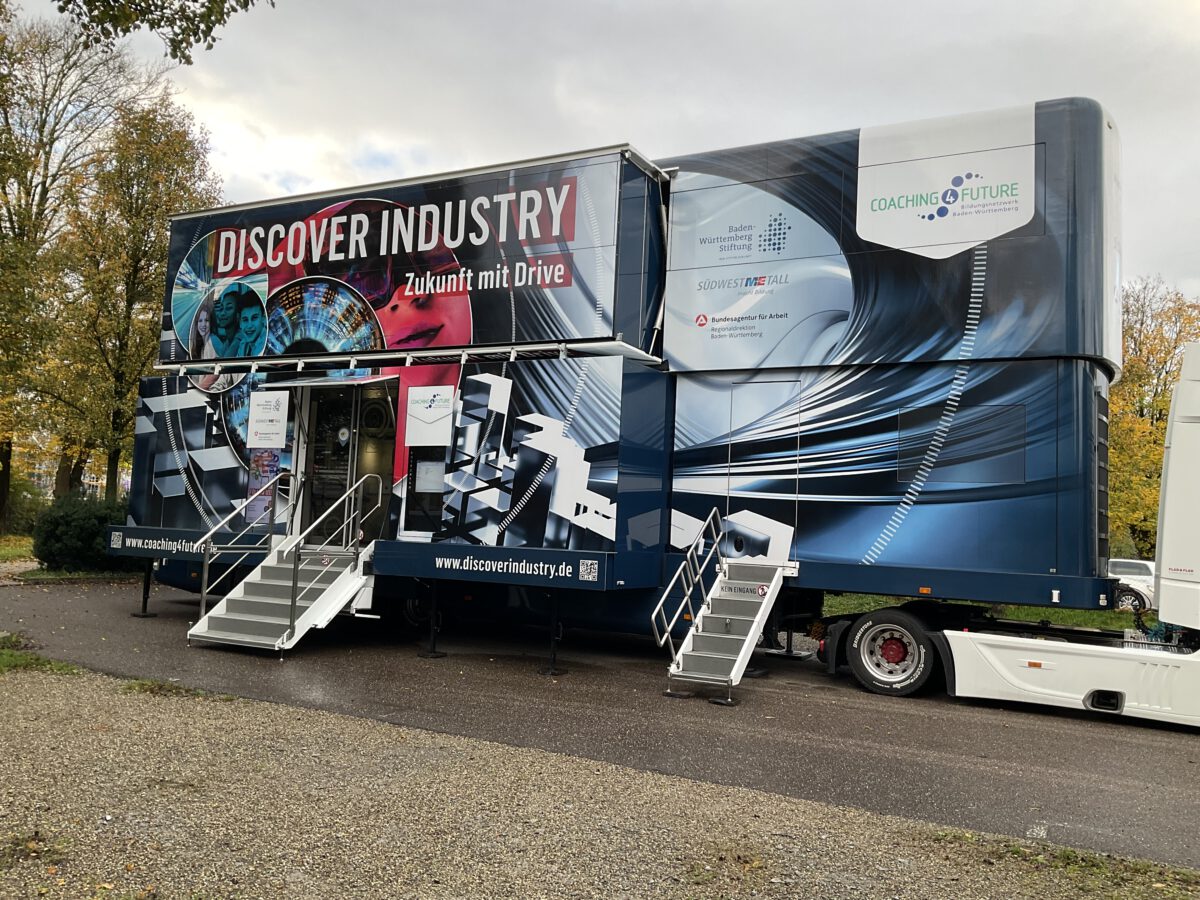 Den richtigen Beruf zu finden, fällt vielen Jugendlichen schwer. Unterstützung erhalten sie in Baden-Württemberg durch das landesweite Bildungsprogramm COACHING4FUTURE, das mit dem doppelstöckigen Truck DISCOVER INDUSTRY von 03. bis 05.11.2025 das Hohenlohe-Gymnasium in Öhringen besucht. Angemeldete Klassen können in einer interaktiven Ausstellung und bei Workshops selbst ausprobieren, wie mit Technologien wie 3D-Scan, Robotik oder Künstlicher Intelligenz in der modernen Industrie gearbeitet wird. Coaches zeigen am Beispiel des digitalisierten Produktentstehungsprozesses welche Berufe daran beteiligt sind und geben Tipps für die Karriereplanung der Jugendlichen.