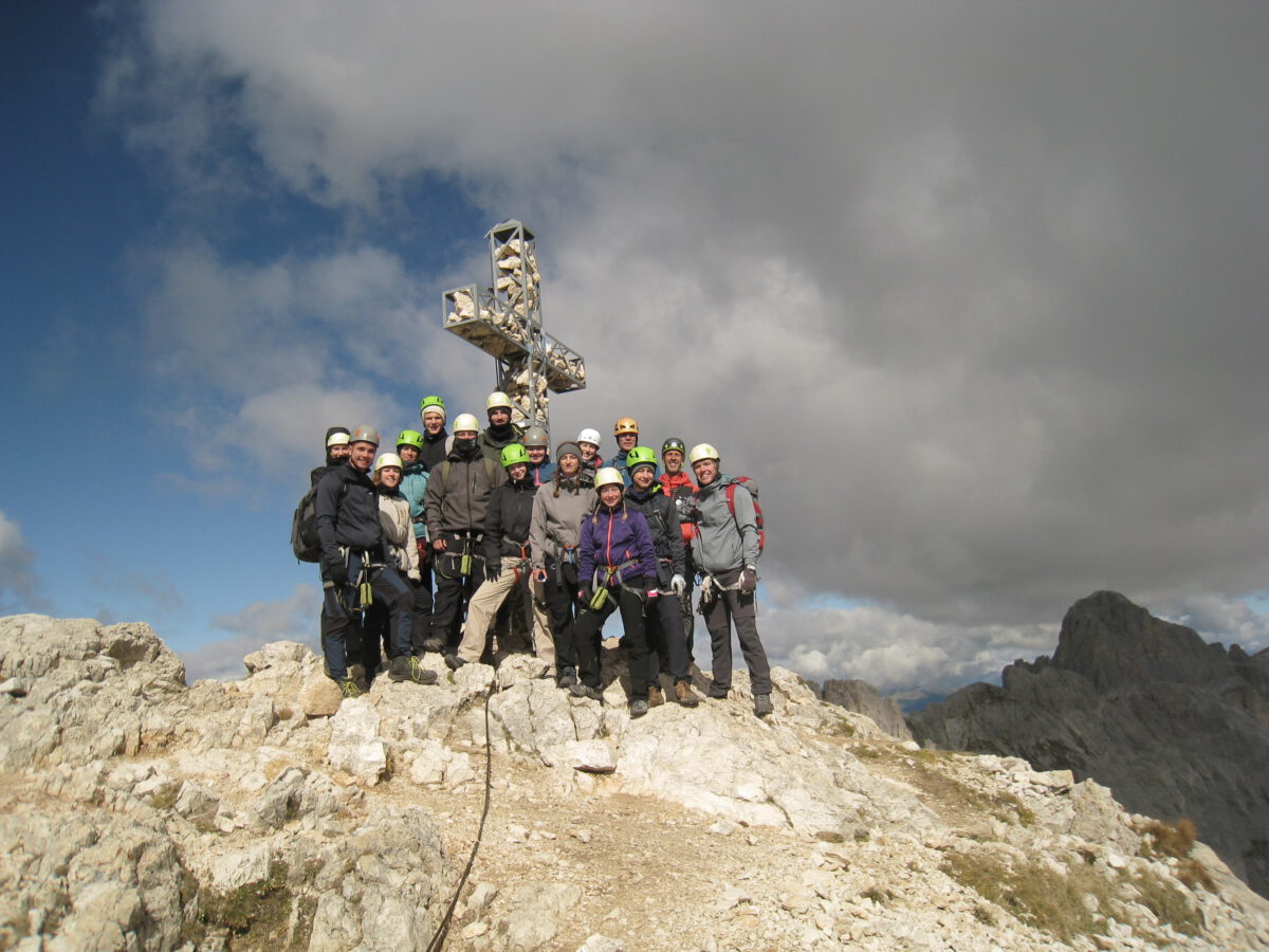 Nun stand der letzte Klettertag an. Anfangs war erst einmal Wandern auf dem Programm, da der Beginn des Klettersteiges über eine Stunde Fußmarsch von unserem Startpunkt entfernt war. Der Steig selbst erwies sich als konditionell anspruchsvoll, aber dennoch traumhaft schön. Unter einem öffnete sich das Panorama Südtirols. Vom sattem Grün der Südtiroler Täler, über das helle Grau der Dolomiten. Das erste Etappenziel, das Gipfelkreuz, war erreicht und man sah, wohin man sich auch drehte, Berge, Wälder und blauen Himmel. Auch Edelweiß und Murmeltiere sagten uns „Hallo“. Ein weiteres Highlight war der Gipfelschnaps, den Bergführer Hans plötzlich aus einer Felsspalte zauberte, um mit uns anzustoßen. Auf dem Rückweg ins Quartier bewunderten wir noch einen smaragdgrünen Bergsee, hinter welchem sich die Berge Südtirols auftürmten, ehe wir den Abend in einer Pizzeria ausklingen ließen. Satt und amüsiert von falschen Reservierungen, Krämpfen im Bein und nicht zahlenden Personen, neigte sich auch dieser Abend seinem Ende.