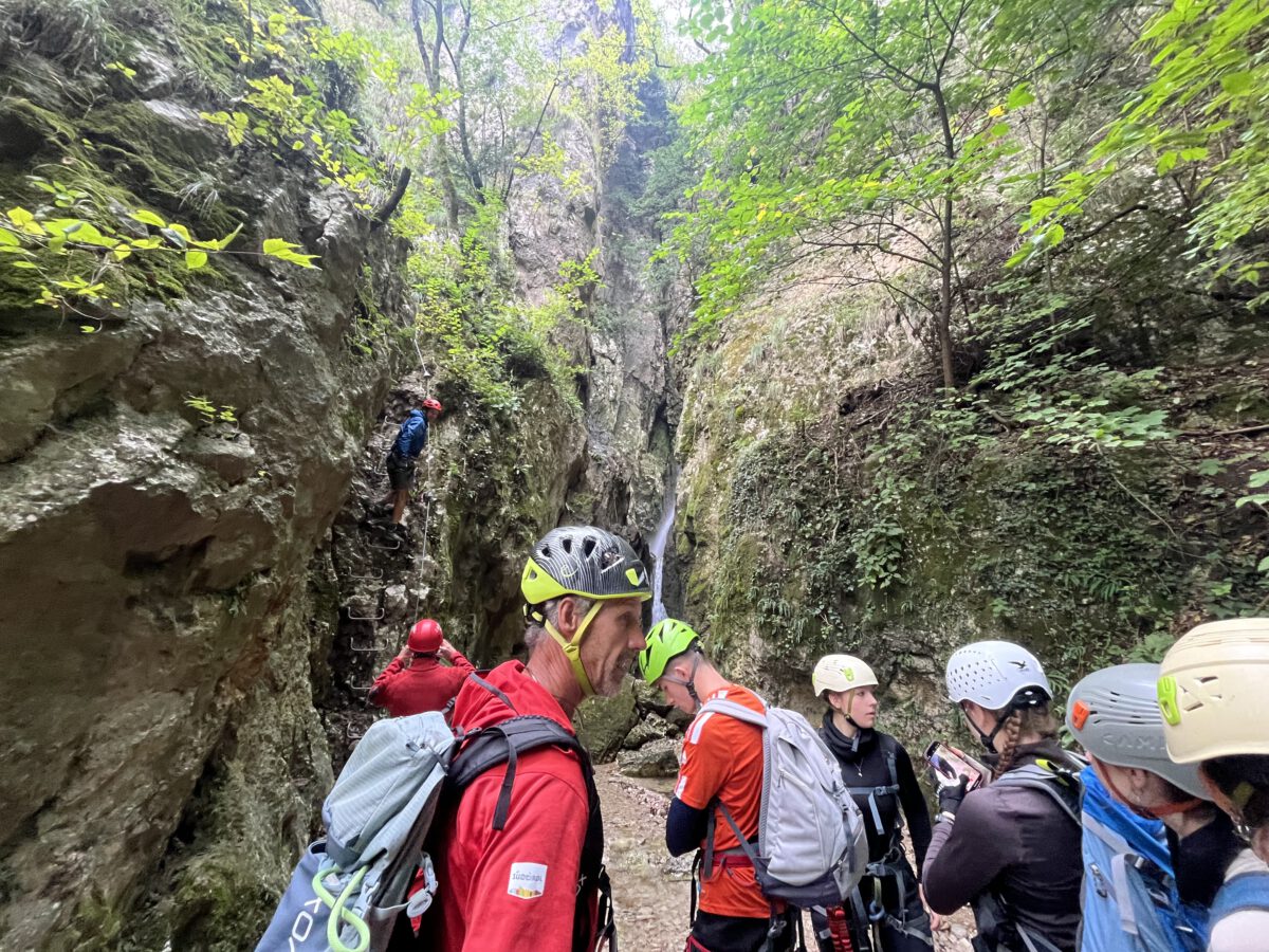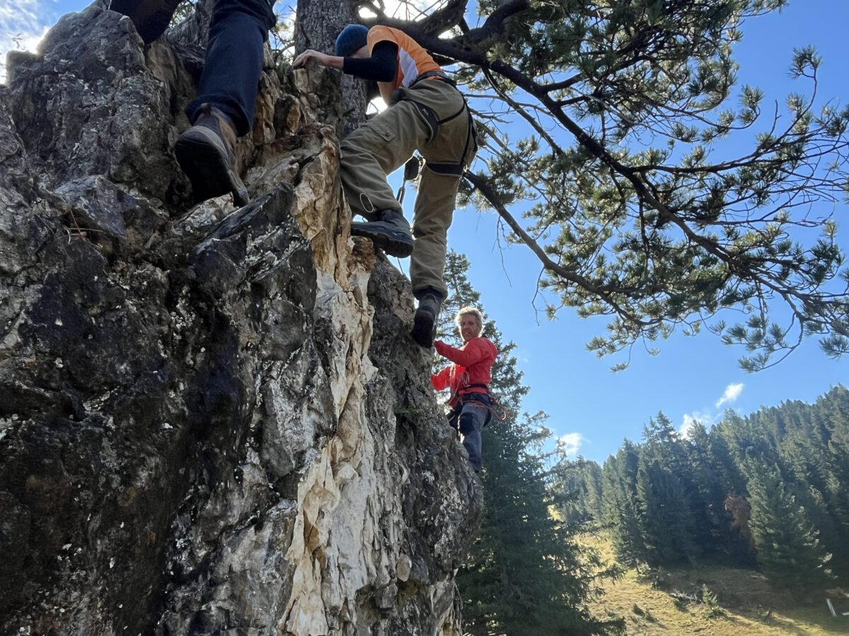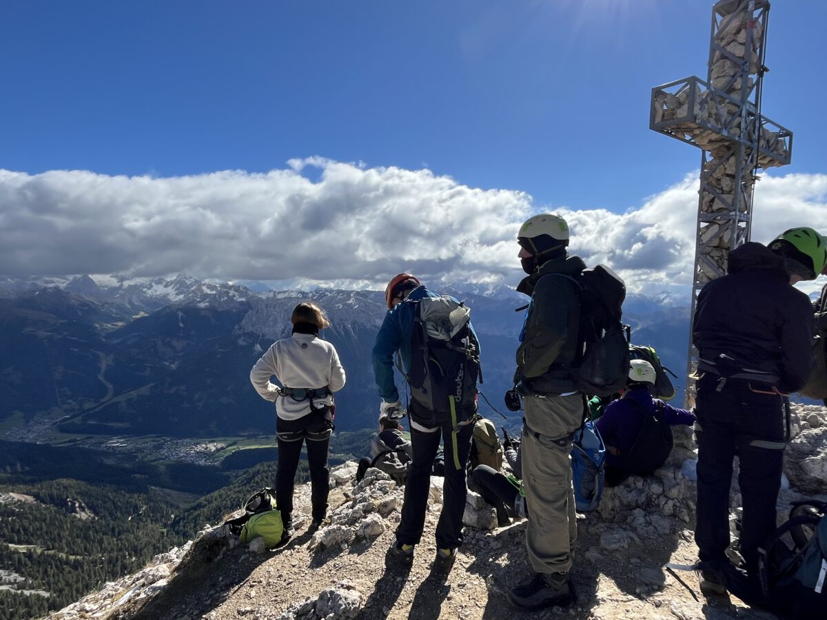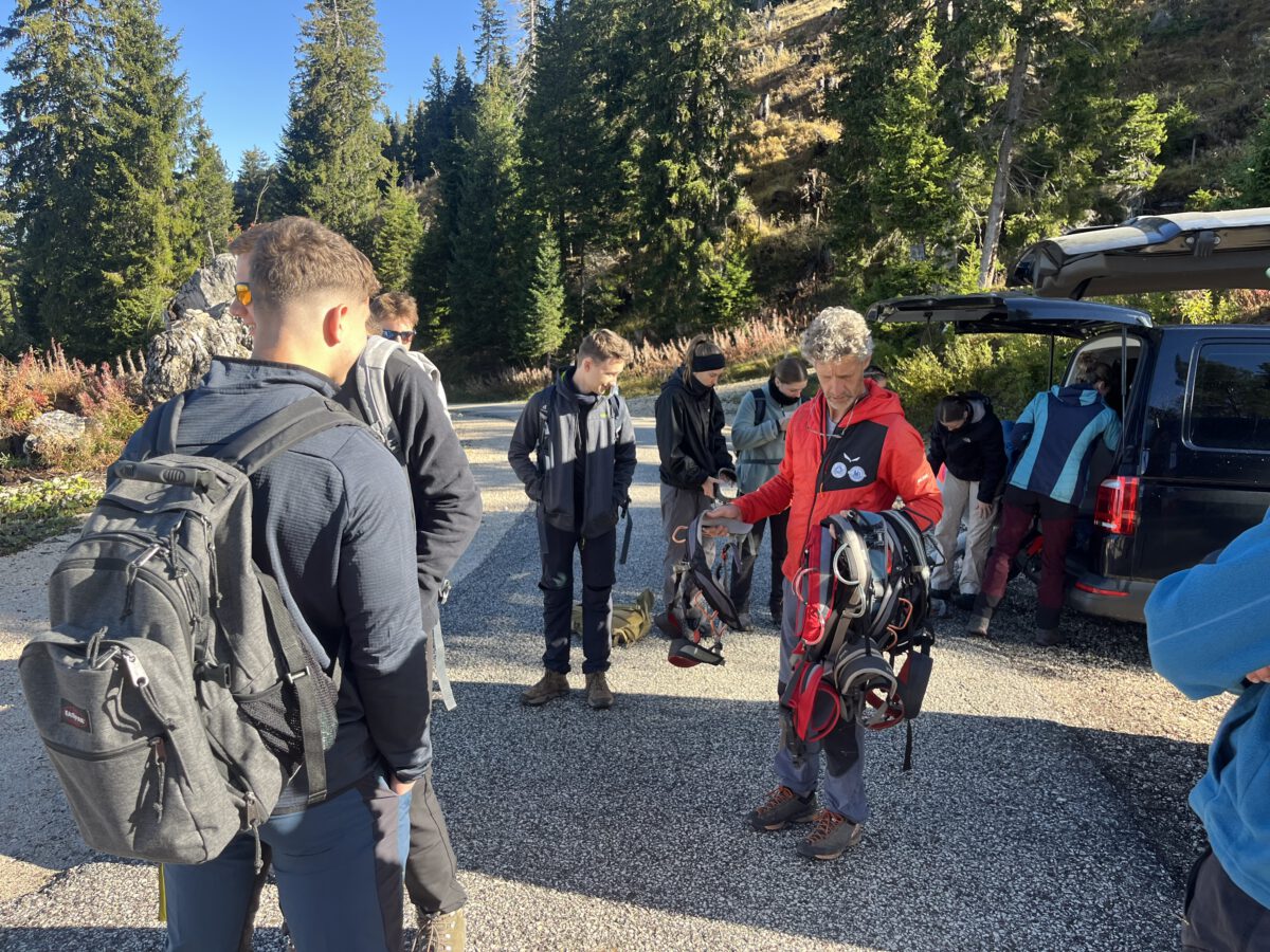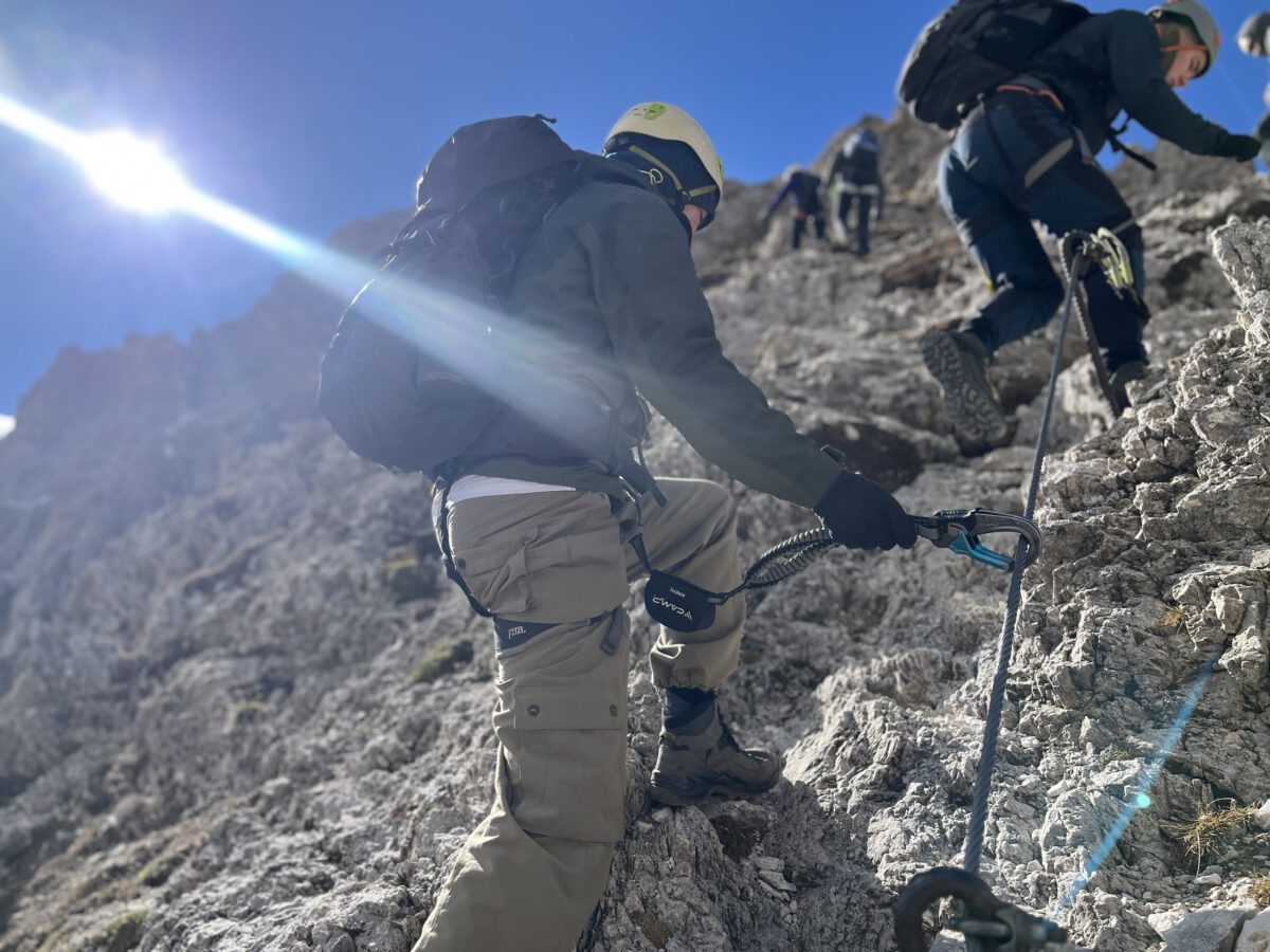 An Tag eins wurden wir von unserem Bergführer Hans begrüßt. Der Südtiroler führte uns die Woche durch enge Täler, tiefe Schluchten, sonnige Höhen und atemberaubende Landschaften. Zunächst erklärte er uns die grundlegenden Techniken des Kletterns, bevor wir selbst an Felswänden üben durften. Anschließend ging es vom Berg in Hans‘ Hochseilgarten.