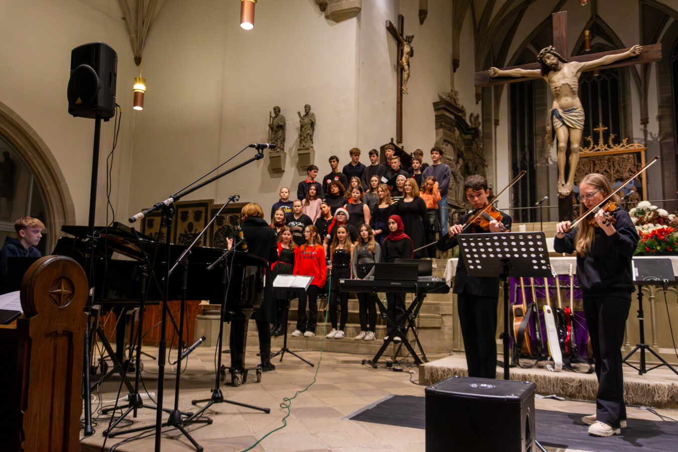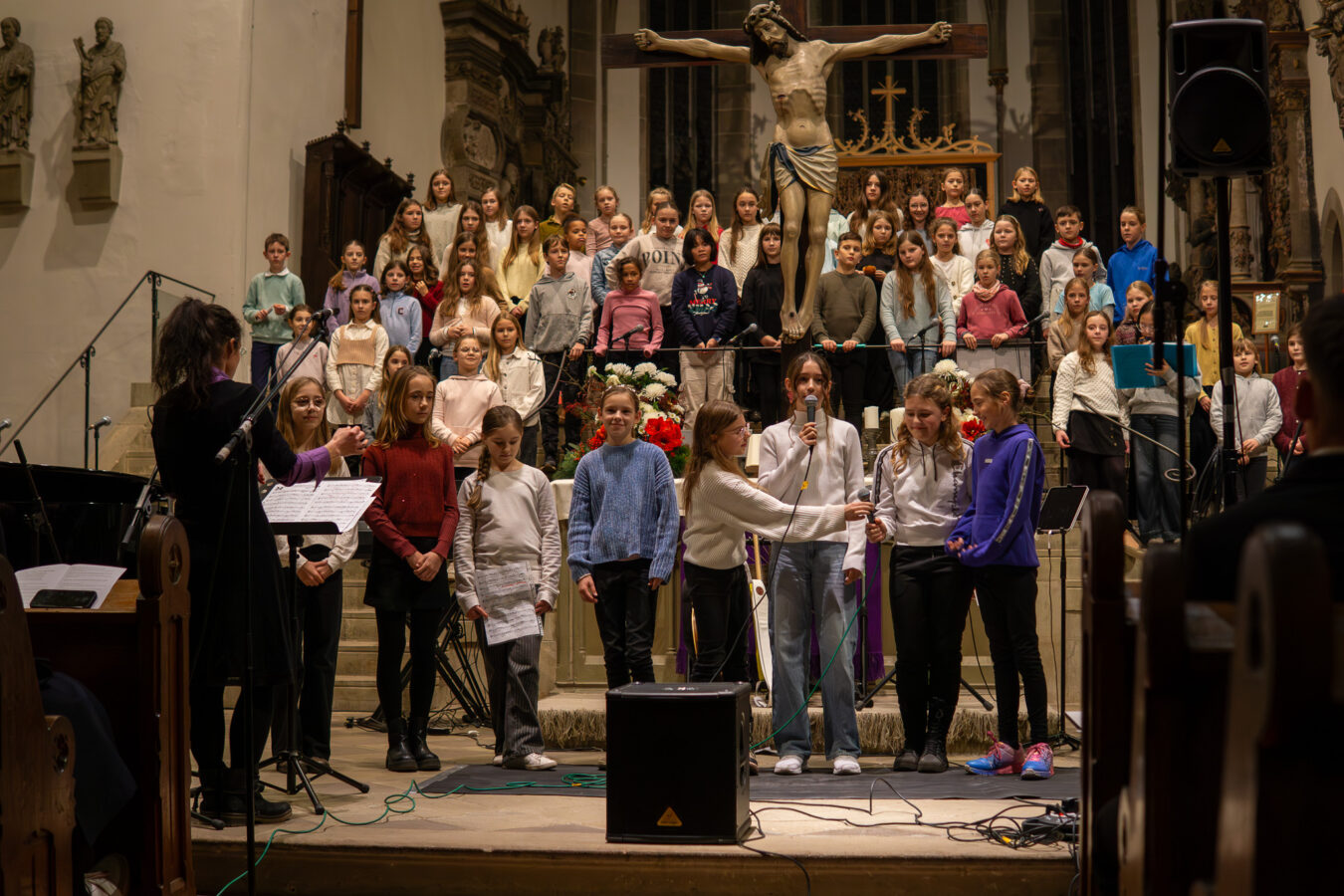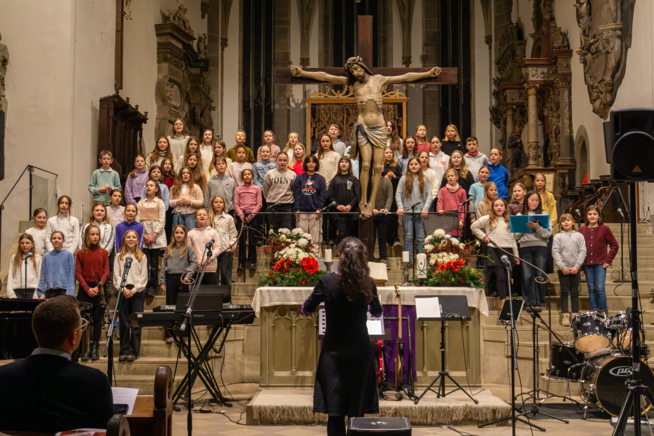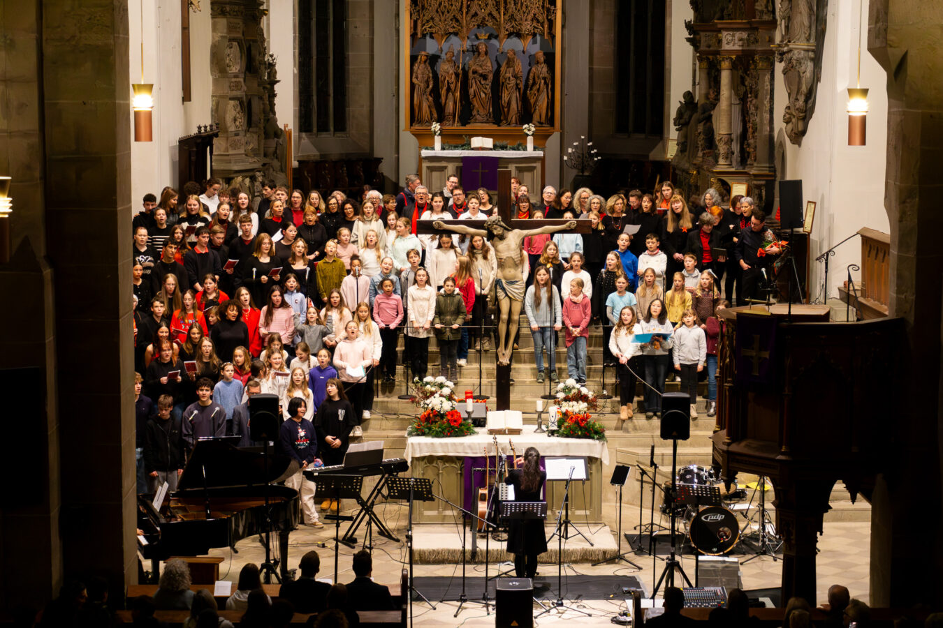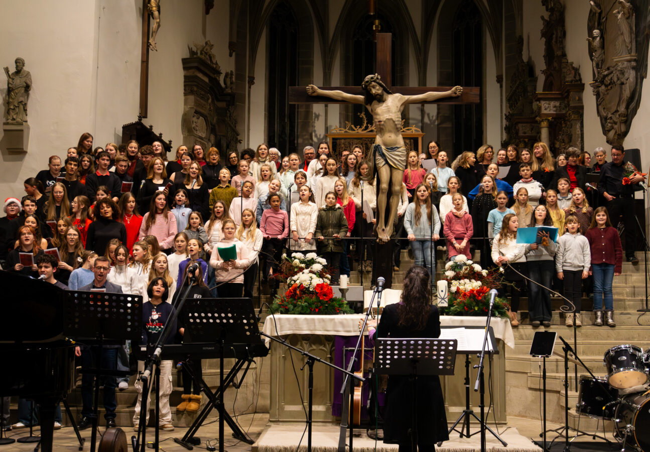 Zum Abschluss wurde „Oh du Fröhliche“ von allen Beteiligten und dem Publikum gemeinsam gesungen – in der voll besetzten Stiftskirche und mit Orgelbegleitung ein beeindruckendes Klangerlebnis, wie man es sonst wohl nur an den Weihnachtsgottesdiensten erleben kann.