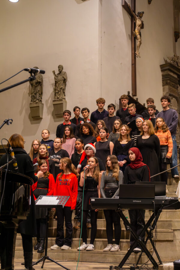 Auch der Mittel- und Oberstufenchor unter der Leitung von Elisabeth Honeker, begleitet von Hannes Dekorsi (Stufe 12) und Nha-Young Ha am Klavier, präsentierte sich nicht nur zahlenmäßig erfreulich stark, sondern auch gesanglich überzeugend. Bei „In the bleak midwinter“ sowie bei „Mary did you know“ beeindruckten als Solosängerinnen einige der jüngsten Sängerinnen des Chores, Viktoria Steinmetz, Milena Horvarth und Serin Kourdi aus der 7. Klasse.
