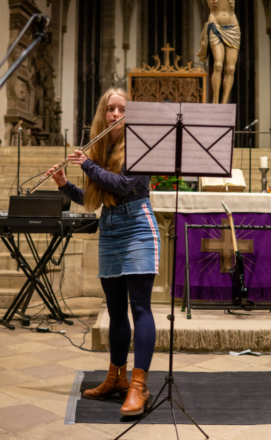 Umrahmt wurden die Auftritte der Chöre von kleineren Instrumentalensembles: Samuel und Santina Munz (6e, 9b) präsentierten als Geigenduo den Weihnachtsklassiker „Jingle Bells“, Lotta Neubauer und Finn Kretschmer (beide 11a) trugen „Macht hoch die Tür“ in einer Version für Querflöte und Klavier vor und Janina Elmer (Klasse 12) spielte „The first Noel“ ebenfalls mit der Querflöte, begleitet von Elisabeth Honeker am Klavier.